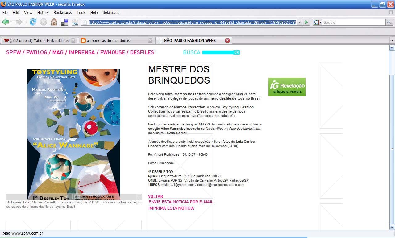 Projeto idealizado pelo artista e stylist Marcos Rossetton do 1º Desfile-toy conceitual no Brasil entre moda x arte com a temática na toyart, em parceria com a artista e toy design Miki W., apresentando a coleção inpirado na fábula de Lewis Carroll, Alice no País das Maravilhas. Presente no projeto, desfile-performance na Galeria Pop de São Paulo em outubro de 2007 e completado posteriormente com uma exposição-vitrine.